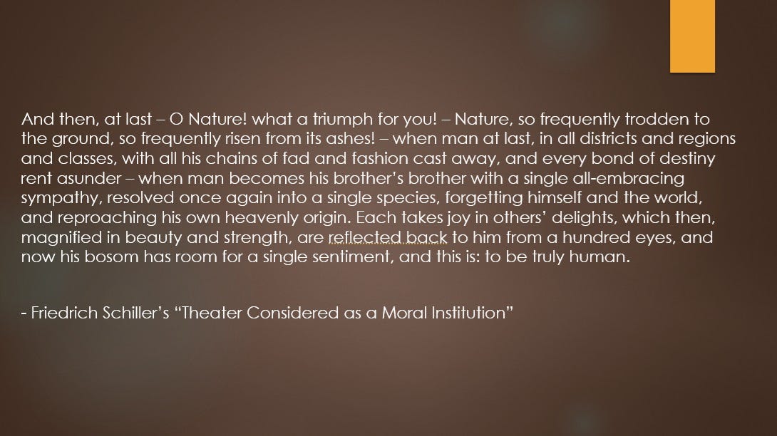 So parting thoughts, and thank you all for your patience, I just want to end with some words by Schiller in his essay “Theater Considered as a Moral Institution” which I think is going to be a beautiful way to end this class: