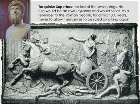 Servius is also murdered in his elder years in a very bloody public display, by Tarquin the Elder’s sons, (along with Servius’ own daughter who married one of these sons). Servius Tulius, to make matters worse for those who began to hold the idea of an “inherited” nobility, an “inherited” aristocracy, was born a slave. When Servius was killed by the sons of Tarquin, it was Superbus (who in the above image is labeled Tarquin the Proud) who took over the throne.