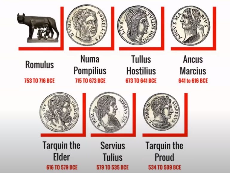 Since Rome was the originator of the concept of a republic, I think it important to go over just a few highlights of what that consisted of. Rome started out as a kingdom from 753 BCE to 509 BCE, it was led by seven kings in all. What’s interesting about Rome’s system of kings is that it was never based off of the hereditary principle, and the King was someone who was voted in by the Senate from the very beginning.
