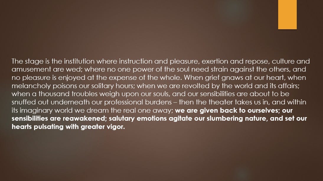 What Schiller is saying here, is that the world we live in is an imperfect world but the world we envision is always going to be more perfect than what we can execute in reality, and sometimes you can get really bogged down by all of the imperfections that have built up in the society that we are born into or find ourselves within but it is through drama that we are freed from those types of shackles, we are brought back to ourselves where our natural desire to not see injustice succeed is reawakened in us. These are good things especially for our youth, to have these reinstilled such that we can have change that is more akin with such noble ideals.