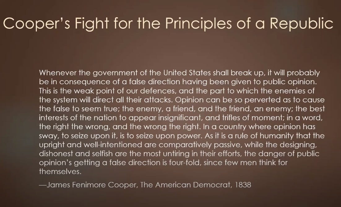 Cooper is very much in the middle of this cultural warfare, this fight for proper education towards proper cultural ideals which can then qualify themselves to be upholders of the principles of a fair and just republic.