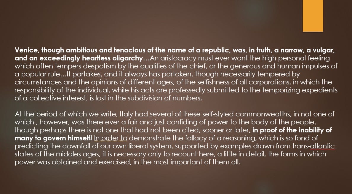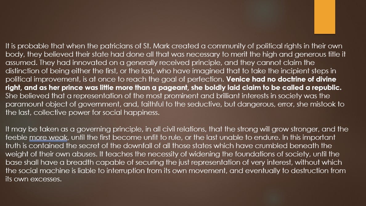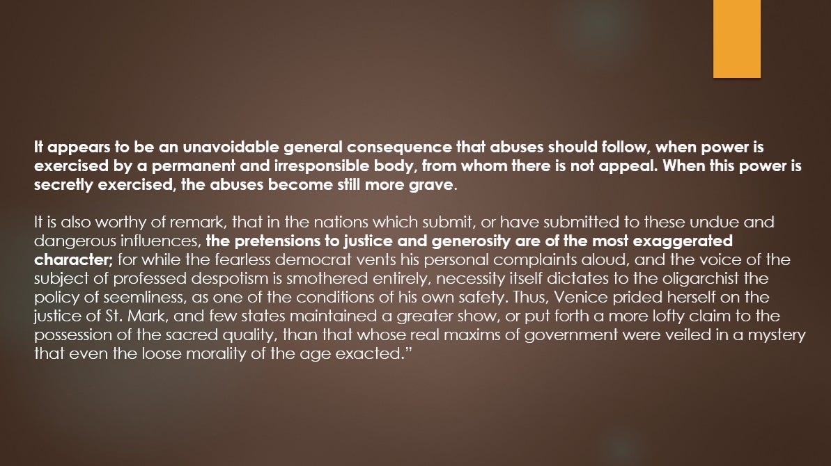 However, as Cooper makes the point, such a system as the Venetian Republic could only uphold justice if it consisted of the most infallible virtue and of infinite intelligence, infinite wisdom to use such power in a responsible manner.