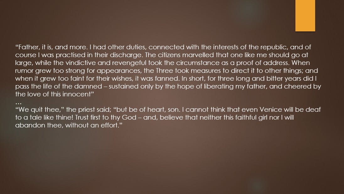So Jacopo thought his father was in exile, but then the state allows him access to see his father in prison, he doesn’t know why. The priest answers: