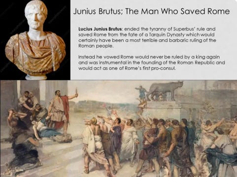 Junius Brutus, who is the ancestor of Marcus Brutus (who we know of from Shakespeare’s Julius Caesar), was one of the men who was present at the scene when Lucretia reports what happened to her. Livy, the historian, writes that as soon as Lucretia had committed suicide, Junius Brutus rushed over to her, plucked the dagger from her breast and raised it, swearing an end to the Tarquin kingship. Brutus gathered all of the Roman citizens together, and they voted to banish the Tarquin family, and he had them swear an oath that they would never suffer the rule of one man to govern Rome ever again. And as per Livy, the Roman people desirous of liberty would vow from that point on to no longer be swayed by the entreaties or bribes of kings.