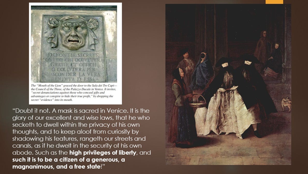 Some things people should be aware of, the below left picture is the ‘Mouth of the Lion.’ Anyone who wanted to do a secret denunciation of another person could write their message and put it into the mouth of the statue and it would be read by the Council of Three. This was a way for them to also gather intelligence and it was a way for people to self-police so you couldn’t trust anyone. Cooper makes the point that what the government has as a standard for itself is going to be what largely influences the bulk of your citizenry. Thus, because the government was so secretive, the people in turn upheld the right for secrecy. So they actually thought of it as a right and it was common for people to walk around with masks over their faces if they wished their identities to be withheld from whatever action that they were involved in.