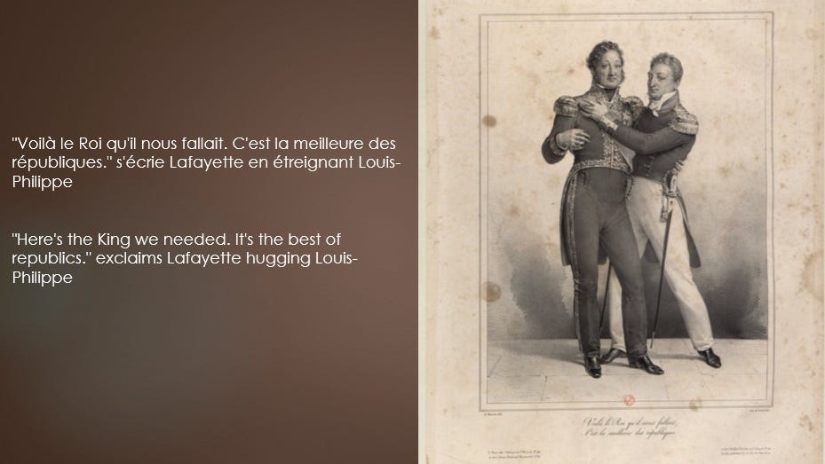 As we were discussing earlier on, everything was resting on the shoulders of Marquis de Lafayette to set up this republic in France, and when the time comes where everything is right for this to happen, he ends up supporting Louis Phillippe as King instead of establishing a republic! As the story goes, Lafayette and Louis Phillippe go out onto the balcony to greet all of the people who are calling for a republic and for Lafayette to be the first president of France. Lafayette then proceeds to announce “Here’s the King we needed. It’s the best of republics” and he hugs Louis Phillippe.