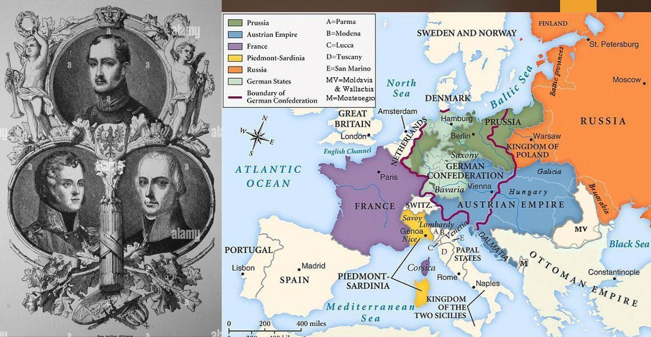 So after the disaster of the Napoleonic wars you have the Congress of Vienna, and they basically want to divvy up Europe, with a balance of power amongst four primary empires that being Britain, Russia, Austria-Hungary, and Prussia. In the image above to the left, you only see the three emperors of Russia, Austria-Hungary and Prussia which made up the Holy Alliance, Britain is left out in typical British manoeuvring where they always seem to succeed in remaining somewhat in the shadows and not front stage in the narrative of historical developments.