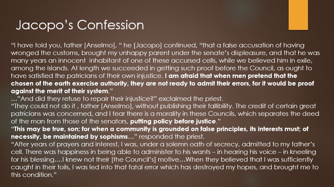 All of the corruptions, the worst types of crimes that were happening in Venice, Jacopo agreed to be the subject of gossip and for the blame to fall on him, to which the state would then manipulate the emotions of the people and have their hatred focus on this one object rather than the system itself. Jacopo agreed to this under threat that his father would otherwise be tortured, and with the hope that they would eventually free his father if satisfied with his services.