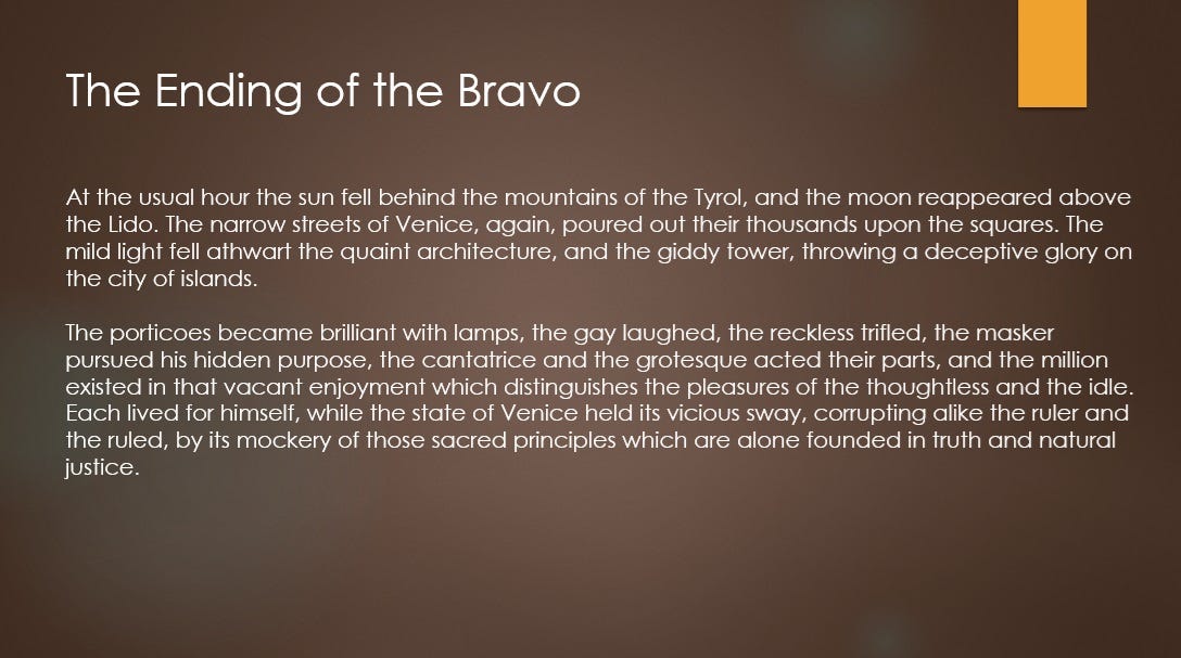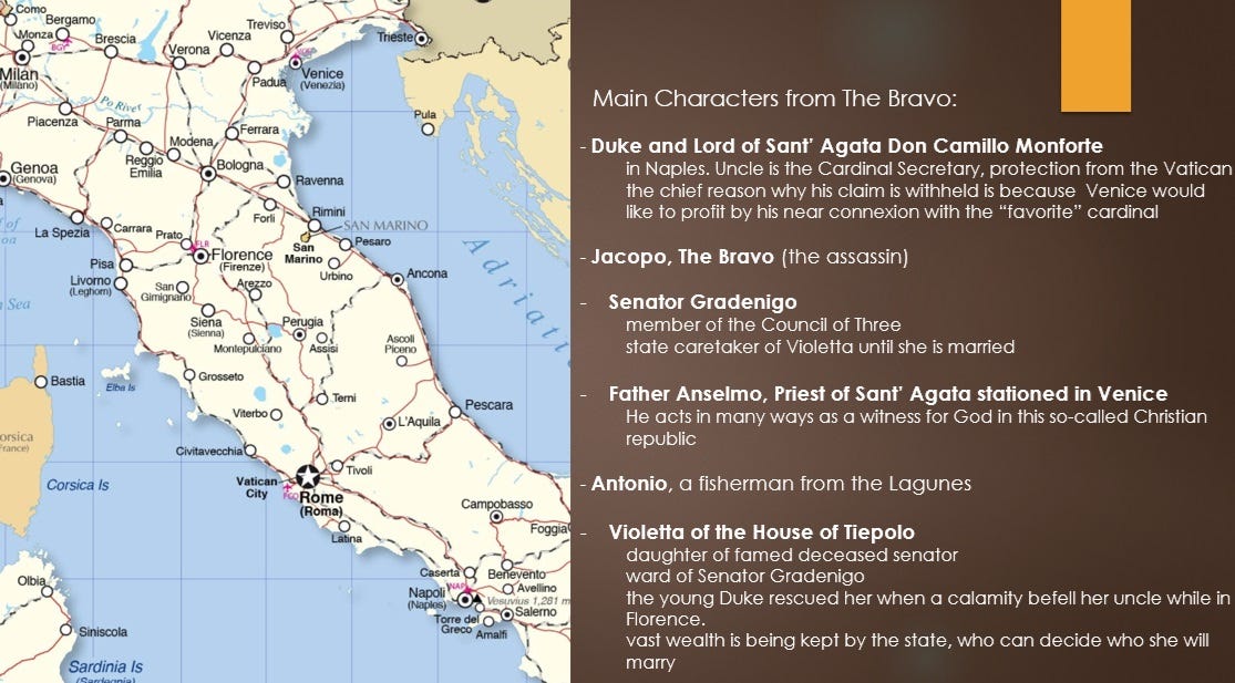 In this story, Cooper focuses on the irrational, lawless character of the oligarchical mind and the struggle between oligarchy and republicanism. He wrote “The Bravo” in 1830, the year of the failure of the second French Revolution. The story is focused on Venice, who as we will see, calls itself a Republic. However, as we investigate what kind of a republic Venice is, we quickly realise that it is very different from what you might expect a republic should consist of. Venice was a very powerful empire in fact, and it’s interesting that Shakespeare and Schiller also made studies of Venice in their works. Cooper, the leading literary figure of America also chose to make a study on Venice. So there is something about Venice…