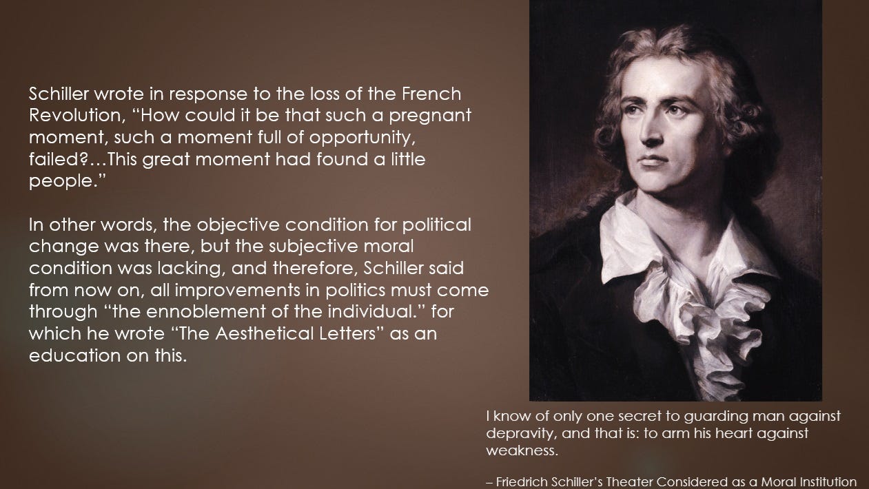 The French Revolution had a lot of the American patriots that were responsible for the success of the American Revolution helping them, so it was a really big failure in that sense. Schiller identifies that the objective condition for political change was there in France but the subjective moral condition was lacking. Thus, Schiller recognised that all improvement in politics would have to come through the ennoblement of the individual.