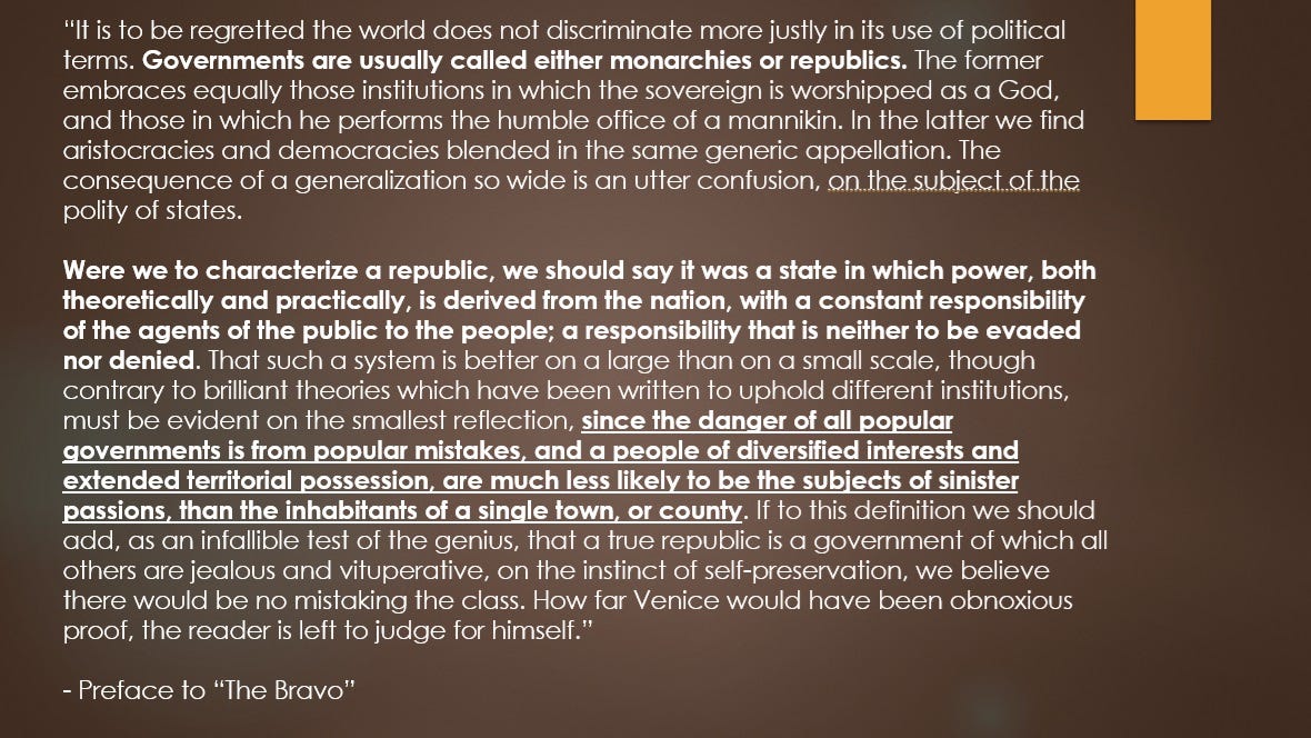 So most people, if they’re aware of Cooper, they will likely be aware of something like “The Last of the Mohicans,” and more broadly his “Leatherstocking Tales”, but they will likely be unaware of a book he wrote called “The Bravo” which will be the focus of the second half of this class. However, before we can discuss “The Bravo”, there is a lot of important historical components and of Cooper’s life that we need to have a comprehension of in order to understand fully what Cooper’s intention was in writing “The Bravo.”