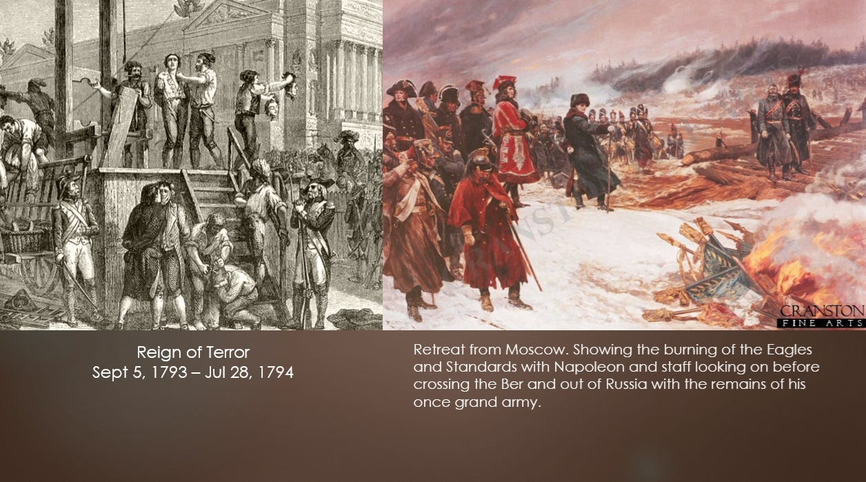In the above image to the right you can see one of the less romantic paintings of Napoleon, in his retreat from Moscow after having lost a good chunk of his army.