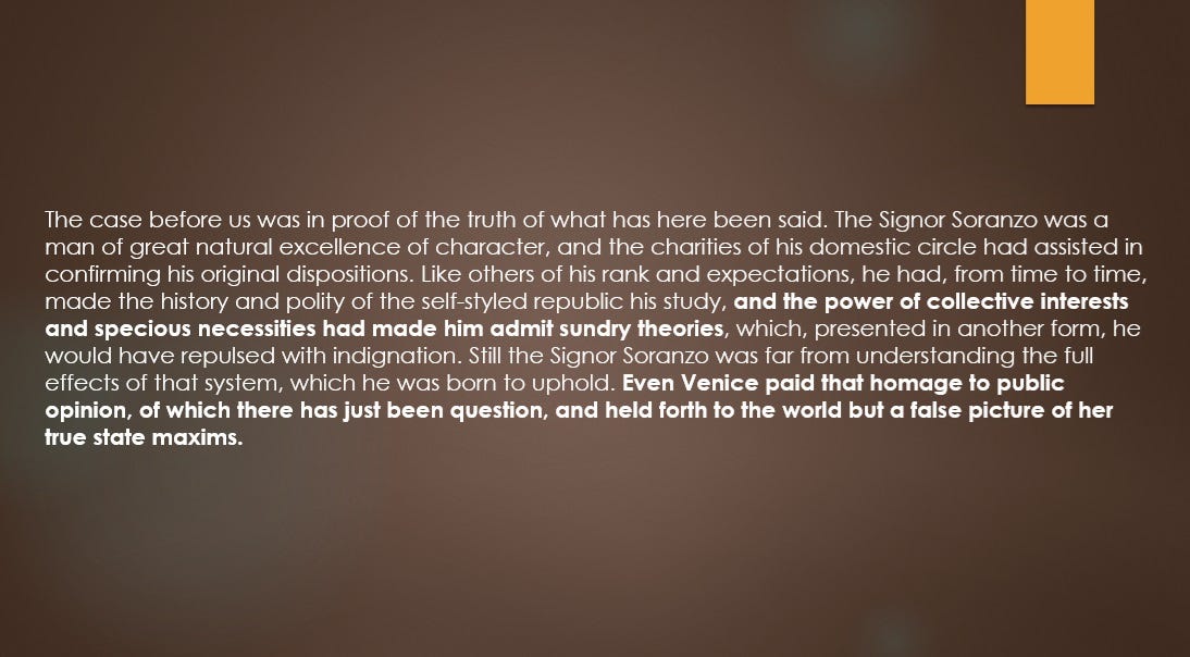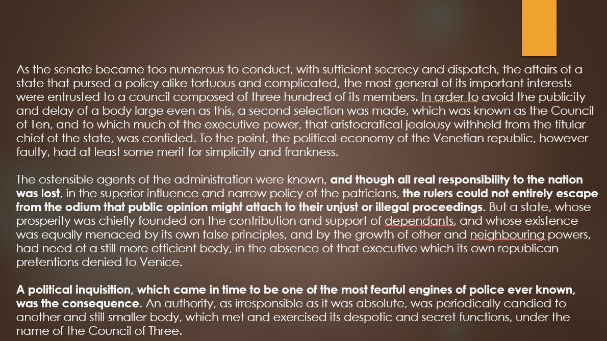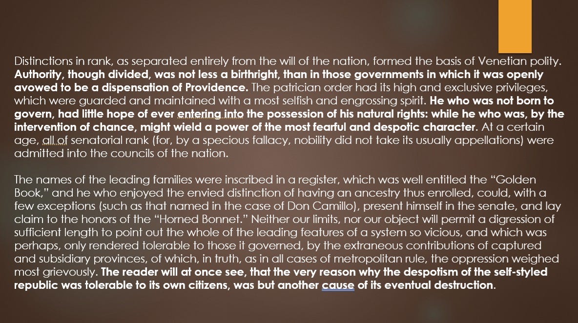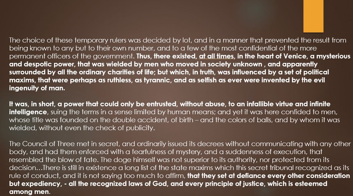 Returning to the above quote, just to be clear, the word expediency means the quality of being convenient and practical despite possibly being improper or immoral, a sort of convenience. Cooper is making the point that it is expediency that truly rules over the state of Venice and not the laws of God.