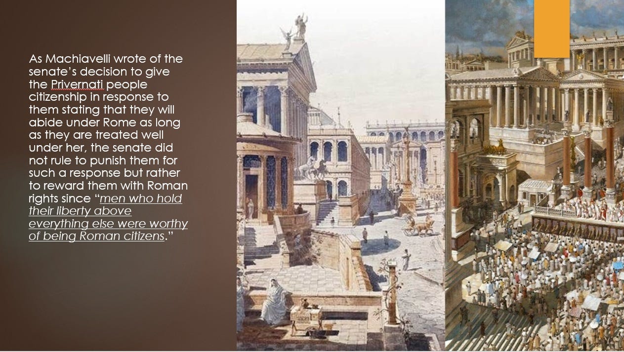 The Roman Republic would exist from 510 BCE to 27 BCE and in its early years this concept of liberty was really taken seriously, that is, liberty from the arbitrary rule of another. Liberty was considered by the Roman people the most noble of all things, such that they respected it when they saw it in a foreign people. Rome, in its beginning period as a Republic, when it was expanding, it offered citizenship to some of the foreign states if they were considered worthy of it and as Machiavelli recounts of the Privernati people, when they were asked if they would become citizens of Rome they answered they would abide by Roman law if they were treated well under her. Instead of being punished for what could have been seen as arrogance, they were rewarded with Roman rights since as Machiavelli writes “men who hold their liberty above everything else were worthy of being Roman citizens.”