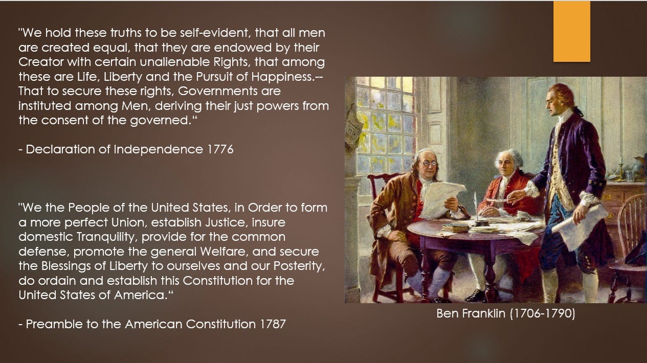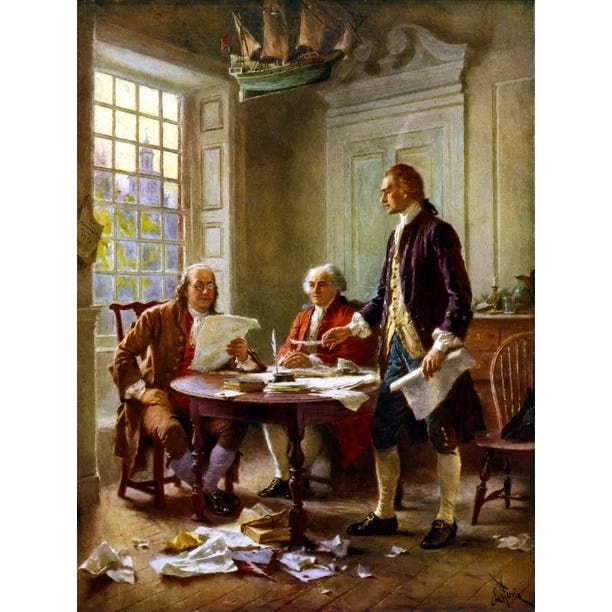 In the painting below titled “Writing the Declaration of Independence,” you can see who is the boss in this situation, Ben Franklin is the approver of any suggestion that comes up in that discussion. Ben Franklin would state at the close of the Constitutional Convention in 1787, in response to a question as to what form of government had been formed, he is quoted as saying “a Republic, if you can keep it.” Thus, it was understood that the upholding of any republic would ultimately be subject to the moral condition of that society.