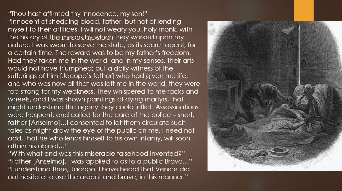 So we find out that Jacopo is in fact not an assassin! The state threatened that they would torture Jacopo’s father if he didn’t agree to serve the state as their secret agent and allowed for his public display as a Bravo, which normally that never happens – Bravos do not gallivant publicly but hide their identities. Jacopo accepted that he would take the blame of all of the assassinations that were going on, which were in fact being executed by the very state.