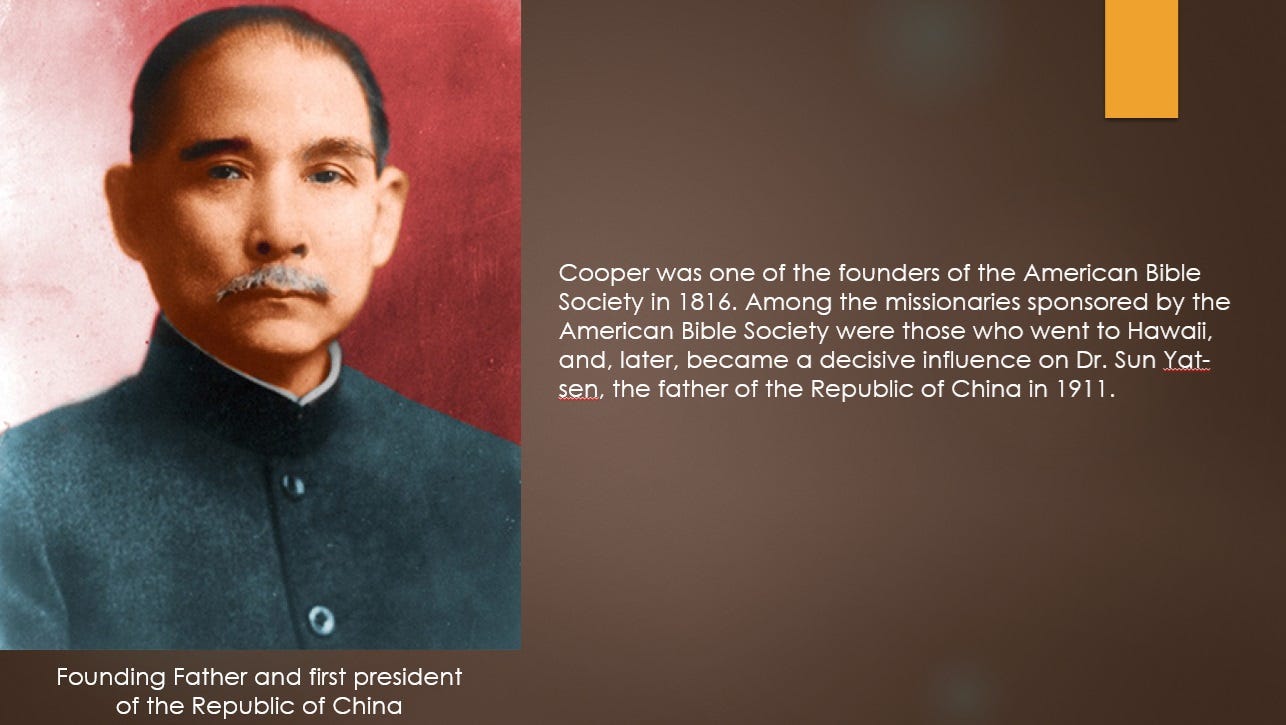 Despite large failures around the whole French situation and the European situation in general, Cooper was one of the founders of the American Bible Society, and among its members would be those who later influenced Dr. Sun Yat-sen, the father of the Republic of China. So, major success on that side of things.