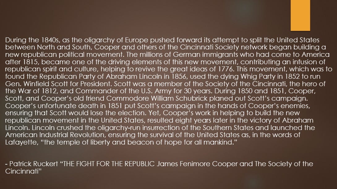 William Cooper was also a part of the Society of Cincinnati and James Fenimore would become a leading member of the Society later on. The Society was formed in part to defend the United States, since there was always the danger that Britain would make an attempt for reconquest since despite winning the American Revolution, British troops would remain in the United States (and stationed in Canada) for quite some time. The Society was also formed to uphold the principles of the Republic, you could say that the presence of the Society within the newly formed 13 states, functioned as a think-tank to uphold this form of government in the best way possible. It was also used in Europe to help facilitate support for the republican movements and functioned as an intelligence operation.