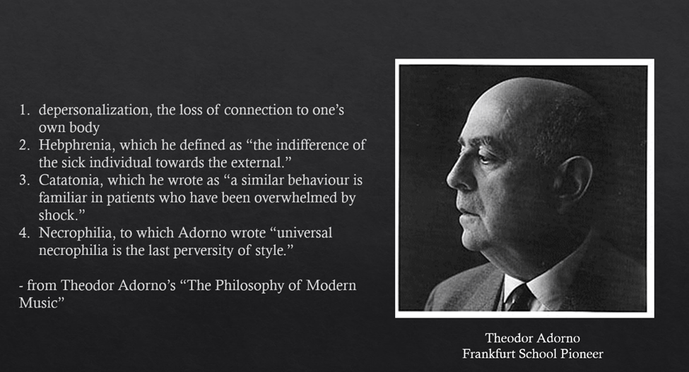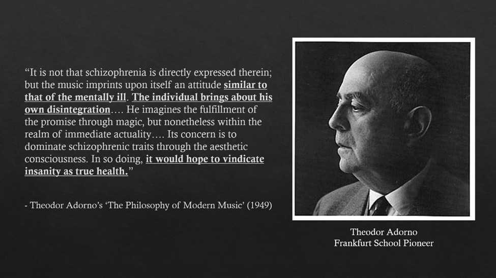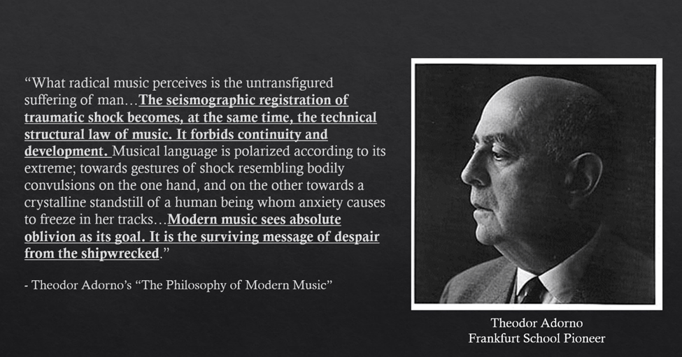 Theodor Adorno in his youth was actually a promising future concert pianist who later studied in Vienna under the atonal composer Arnold Schoenberg. In 1946 while in the United States working on the Frankfurt School’s cultural pessimism agenda he wrote the book “The Philosophy of Modern Music” as a diatribe against classical culture.