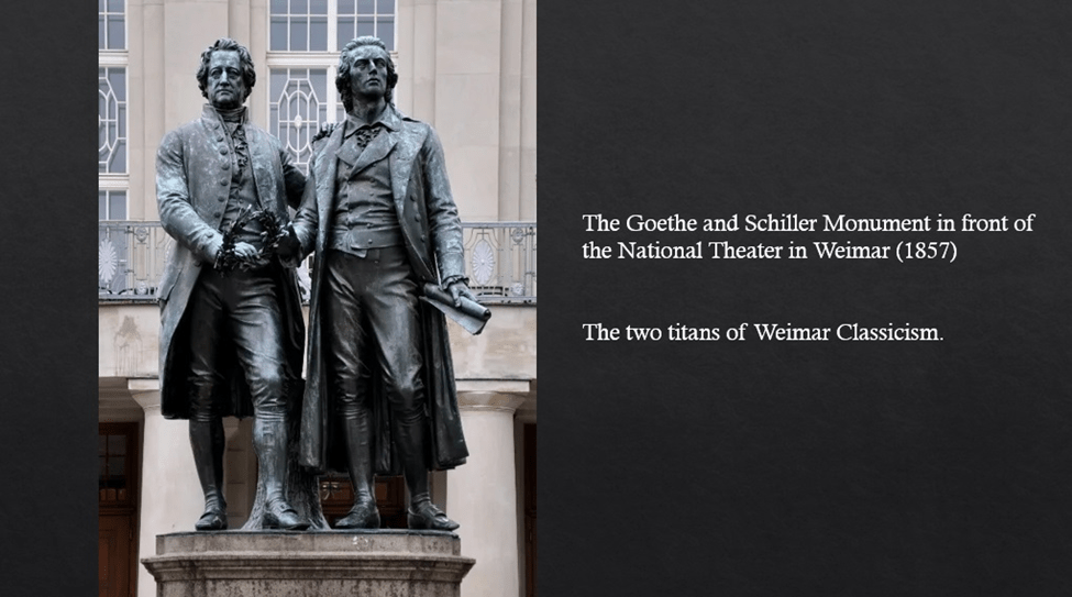 Goethe who is still remembered and celebrated in Germany was a close friend and ally of Schiller. Both Goethe and Schiller were recognised in the 19th century as the two most revered figures in German classical literature. Both men had lived in the city of Weimar located in central Germany and were the seminal figures of the literary movement known as Weimar Classicism. Weimar Classicism, contrary to what Wikipedia would have you believe, was never a new humanism which emerged from the ideas of Romanticism. In fact it was the mythologies of the Romantic movement that launched a form of cultural warfare against the German classics.