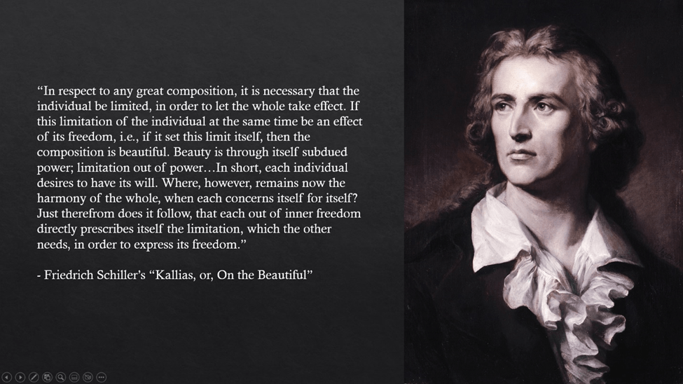 “In respect to any great composition, it is necessary that the individual be limited, in order to let the whole take effect” this is contradictory to the Frankfurt School prescription against totalitarianism, where they claimed that the antidote to fascism was to focus on the ultimate liberation of the individual and that the individual’s freedom is now the ultimate priority of anything. Schiller is saying that it is basically impossible to live in a world that way and we are not our happiest when we are living in such a world that is consumed with only ‘the self.’