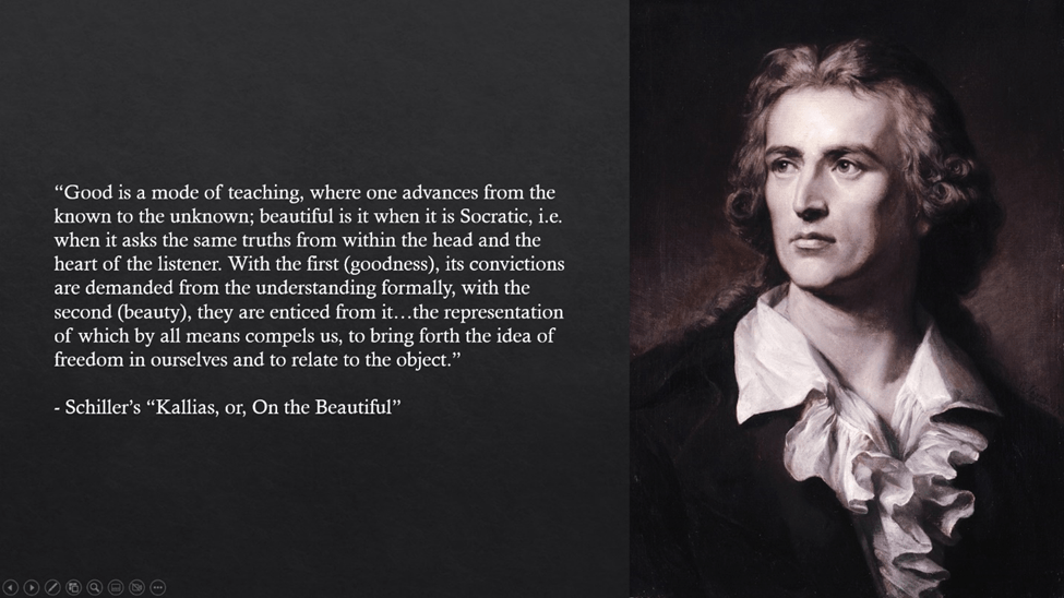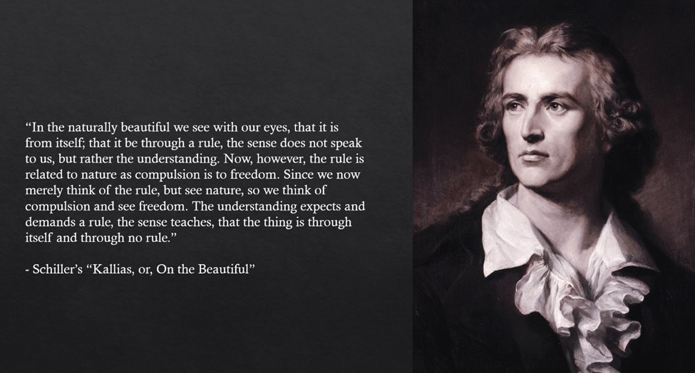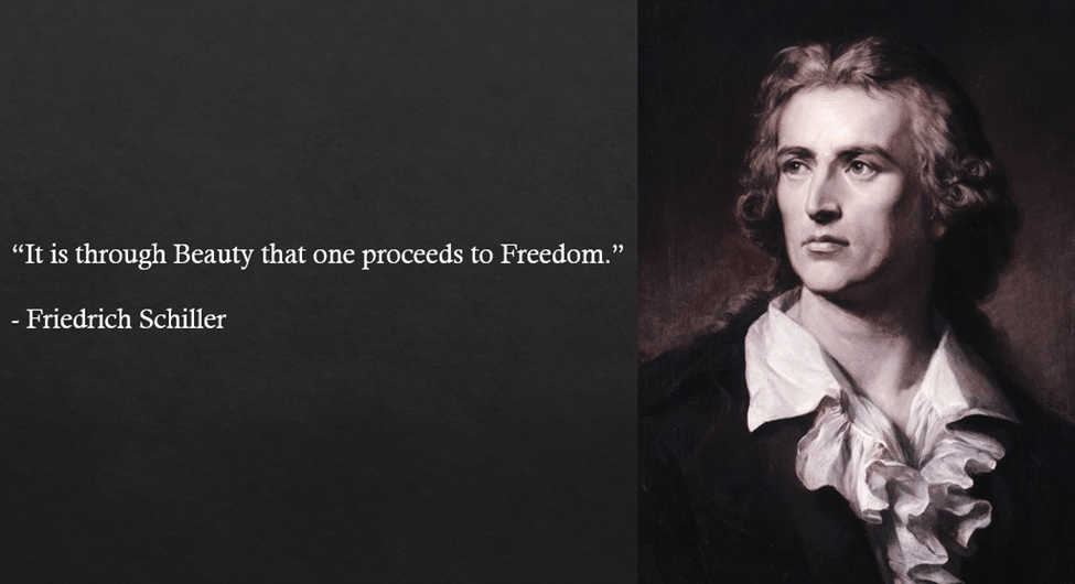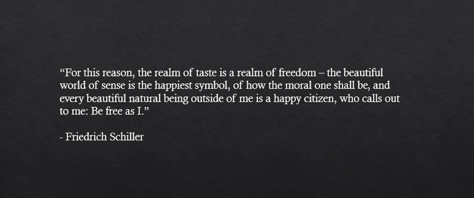 Kant makes the point that Beauty in Art is appearance and thus is removed from an idea of Purpose, however, Schiller disagrees with this and says that Beauty is not just about appearance but there also has to be an idea of Purpose. Schiller makes the point that that Purpose which acts on us instinctively (that is without thought) is this idea of Freedom. So we find things that are most beautiful that are emblematic in whatever way of Freedom and symbolically challenging oppression. That’s what we find the most beautiful.