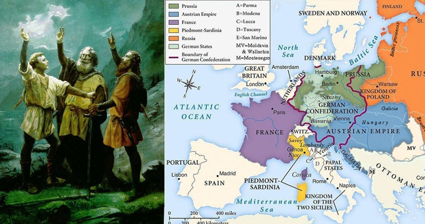 Germany during the time of Schiller’s writing “Wilhelm Tell,” was not a sovereign nation but rather was ruled between the Austrian Habsburg Monarchy and the Kingdom of Prussia. After the Napoleonic era, the Congress of Vienna founded the German Confederation (as a replacement to the Holy Roman Empire), loosely made up of 39 states. The Emperor of Austria held the permanent “presidency” of this German Confederation until the Seven Weeks’ War between the Kingdom of Prussia and the Austrian Empire in 1866. Prussia won and took over the “inherent right” to rule the German lands.