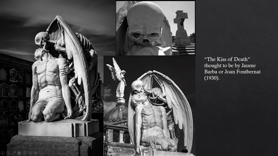 The “Kiss of Death” which a lot of people think is beautiful and romantic, although when you look at the skull straight on, it doesn’t really look so much like a kiss rather than the sucking of the life essence of this person, but we’ve become seduced by this kind of Dracula like concept death. Death has become a kind of beautifully morbid concept.