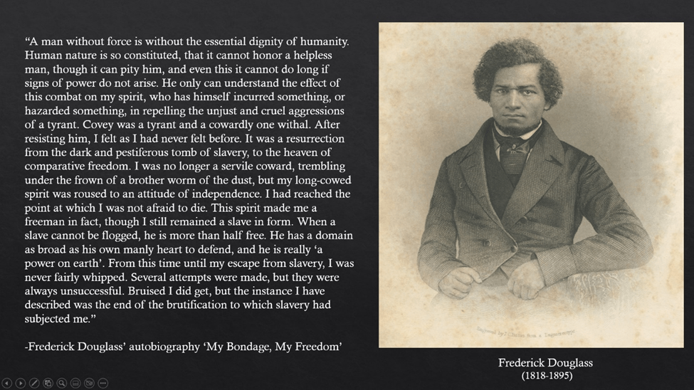 Frederick Douglass was a man who was born into slavery under some of the most extreme forms of oppression and brutality in the South. He was told that his nature was everything contrary to what he discovered his true nature was. And the question was how did Douglass do this, because he didn’t have any example in his life of any kind of positive role model. He was never presented with any refutation that he wasn’t indeed inherently born to be a slave and that was not his natural condition, and yet he was still able to reject it from a very young age. He goes through his thought process in his autobiography which is really I think key for so many people to read nowadays in order to help us on our journey to get out of this false construct we find ourselves in.