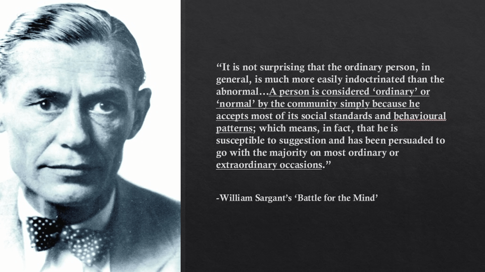 Sargant remarks that this adaptability to a changing environment is part of the ‘survival instinct’ and is very strong in the ‘healthy’ and ‘normal’ individual; where they can learn to cope and continue to be functional despite an increasingly unstable environment. Thus, it was our deeply programmed ‘survival instinct’ that was found to be the key to the suggestibility of our minds. That the best ‘survivors’ made for the best ‘brainwashing’ in a sense; since the focus was purely on the adaptation to the environment in order to survive and not in questioning nor challenging our surrounding circumstances.