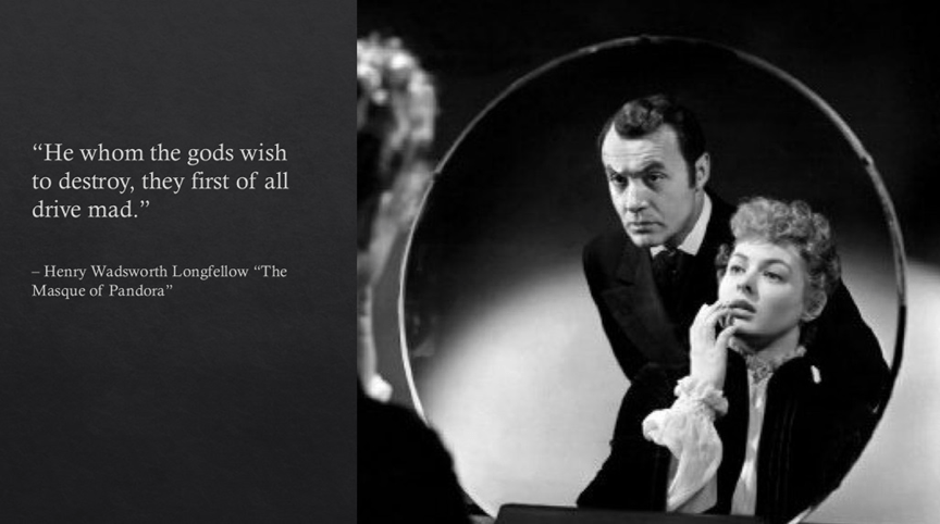 This is the movie I was speaking about at the beginning of this lecture directed by George Cukor, who had overlap with the Frankfurt School, which is a useful movie if you know how to think about it and is what originated the term “gaslighting.” I am not going to go through too much of the details of the storyline but the point being that this woman (Paula) who finds herself in an isolated situation, the man (Sergis) in the above picture is someone she married very quickly, she doesn’t know him very well. Because she is isolated, with only her new husband who is the only person around her except for house servants that he has hired, her reality increasingly becomes shaped by this man and she gets to a certain point where she’s begins doubting her own sanity.