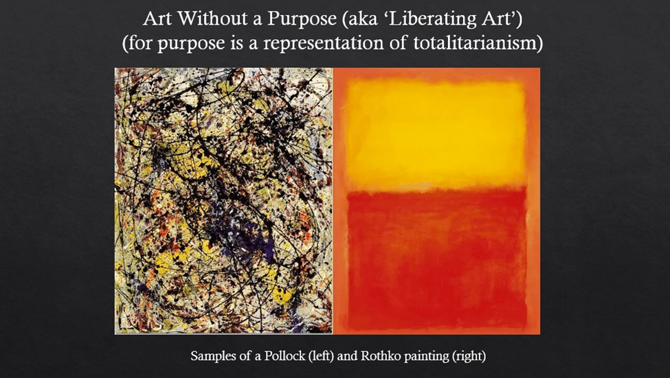 Art without a Purpose became the new Liberating Art, for purpose had now become a representation of totalitarianism. The logic of the cultural Cold War asserted that since communism and fascism relied on realist rigid iconography to advance itself, the ‘free world’ on the other side of the Iron Curtain would rely on abstract emotional freedom. Where communism was based on the sacrifice of the individual for the good of the whole, this Cold War ‘democracy’ asserted that the needs of the whole were separate from the arbitrary freedom of the individual to do whatever ‘feels good’. The degree to which the new modernism offended order and logic was proportional to the degree to which it defended democracy and liberal capitalism.