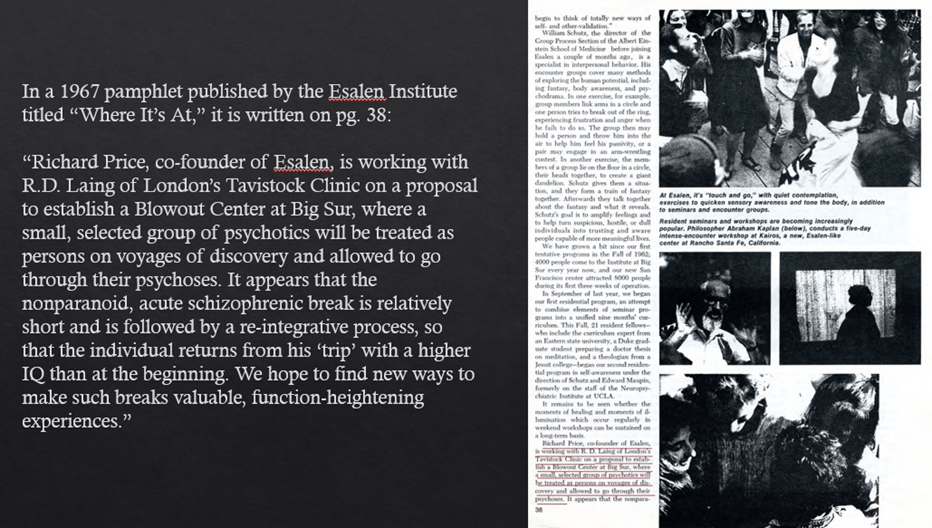 So thus, the inducing of schizophrenic breaks, they were claiming, was a function-heightening experience, clearly not true. As we see with a lot of these people who went through MK Ultra programs which this is linked with directly. The “key to reaching maximum human potential” these people were told which was what the Esalen Institute was all about – the human potential, was through the induction of Madness, the fragmentation of the mind through schizophrenic breaks with the promise that one would have a higher IQ at the end of the whole affair.
