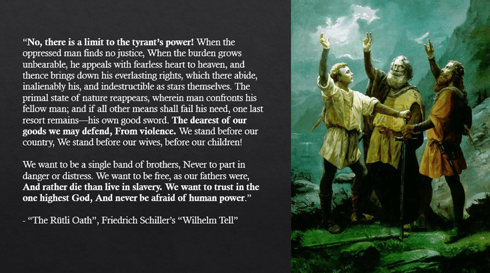 Another very famous drama that Schiller wrote was Wilhelm Tell which is a story that partakes in real history, of how Switzerland became a Republic in opposition to the ruling monarchy/empire that was subjecting the people at the time. And the Rütli Oath was made famous because of Schiller’s play Wilhelm Tell.