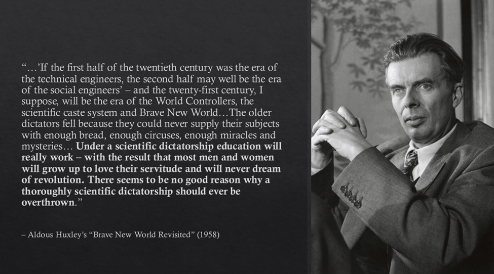 Aldous Huxley was on the frontline of this cultural transformation, other people like H.G. Wells and Bertrand Russell, were very much at the start of looking at the world differently because it was decided that the old world of the Classics was actually at the source of the world’s problems.