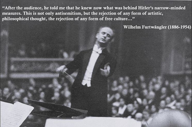 In 1933, Furtwängler met with Hitler to try to stop the antisemitic policy in the domain of music. Berta Geissmar, a close associate of Furtwängler, wrote “After the audience, he told me that he knew now what was behind Hitler’s narrow-minded measures. This is not only antisemitism, but the rejection of any form of artistic, philosophical thought, the rejection of any form of free culture…”