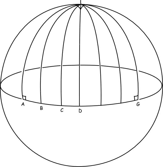 As is now understood, line A and line G, can be measured as 90 degrees from the equator line and thus are parallel lines, and yet they can eventually interface with each other if the surface is curved [see image].