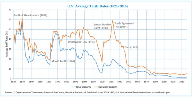 As we can see from the above graph, it was most clearly under the Lincoln administration that protectionism was reintroduced, to the vehement protest of the Southern Anglophiles and the British.