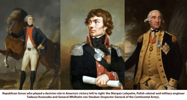 Franklin had already organized his allies in Prussia where Friedrich the Great voiced open support for the cause and the great military strategist Wilhelm von Steuben became the Inspector General of the Continental Army providing military drills and modern military techniques to the undisciplined “citizen soldiers” of the USA. The republican Polish military engineer and colonel Tadeusz Kosciuszko served as Brigadier-General in the Continental Army and the young Marquis Lafayette who arrived illegally in America along with other French troops before the 1778 alliance treaty, made invaluable contributions to the cause. Over twenty generals of the Continental Congress were Irishmen, and many led the later efforts to create an Irish revolution in 1798-99.