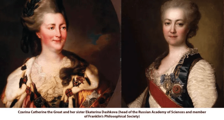 In his ambassadorial station in France, Franklin met many members of the European intelligentsia- including key Russian figures. Among them included a young woman named Ekaterina Dashkova– the young friend and confidante of Catherine the Great and president of the Russian Academy of Sciences who became friends with the elder scientist and was soon inducted into Franklin’s Philosophical Society (becoming the society’s first woman and first Russian). In turn, Dashkova made Franklin the first American member of the Russian Academy of Sciences in 1781. It was through these connections that Franklin played a leading role in organizing the League of Armed Neutrality under the helm of Catherine the Great which ensured that vital supplies and arms would make their way from Europe to America without being blocked by British ships. Within the first 12 months, this League grew to include the Netherlands, Denmark, Sweden, Austria, and Prussia. To this day, Russia’s league created the foundations of Maritime law.