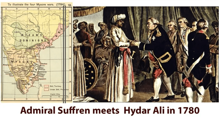 Franklin’s French networks had deep connections into India as well, which made themselves felt in the French-Indian alliance of 1780 that saw pro-American Muslim leader Hydar Ali lead thousands of Indian soldiers on a march across Western Ghats where they attacked the strategic British Base of Fort St. George near the Port town of Madras. Ali was supported by French troops on land and sea under the command of Admiral Suffren. Hydar Ali had already defeated the British in 1760 and represented a powerful independence force in India that kept British oligarchs up at night (It would still be many years before Britain would gain control of this “Crown Jewel” of the empire). During this conflict, Hydar Ali’s forces innovated rockets which decimated British troops, and forced Britain to re-direct over 20% of their naval fleet from fighting in the Americas- this was a vital boon to the French and American forces a world away. Hydar Ali’s son Tipu Sultan even wrote a message to the Continental Congress in 1781 saying: “every blow that is struck in the cause of American liberty throughout the world, in France, India, and elsewhere and so long as a single insolent savage tyrant remains the struggle shall continue.”