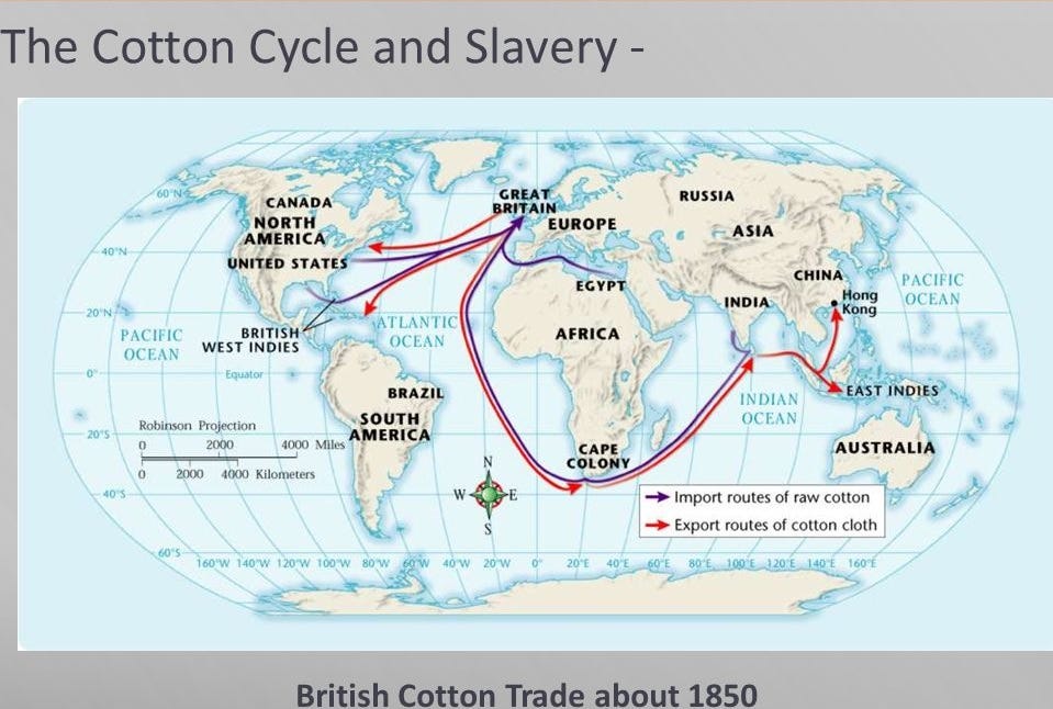 In other words, the cotton plantations that ran on slave labour in the American South, were in service of the British Empire’s global cotton trade which also ran on slave labour from India and conducted terrible exploitation of its British cotton workers.