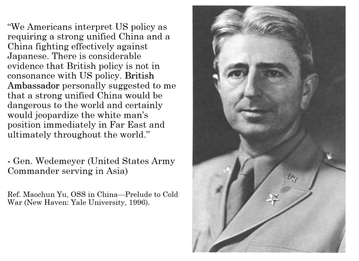 General Wedemeyer, who was a United States Army commander who served in Asia during World War II from October 1943 to the end of the war, recognised one of the major reasons why the CPC (Communist Party of China) and the Kuomintang were unable to form an alliance against the Japanese was due to British sabotage and instigation. The British were playing the same old same old imperial game of flaring up the bad blood that had already developed between the two groups, the age old game of divide and conquer. The CPC did recognise that this would ultimately lead to the balkanisation of China, if the union of China against the Japanese imperialists was not put forward as the number one priority before all else.
