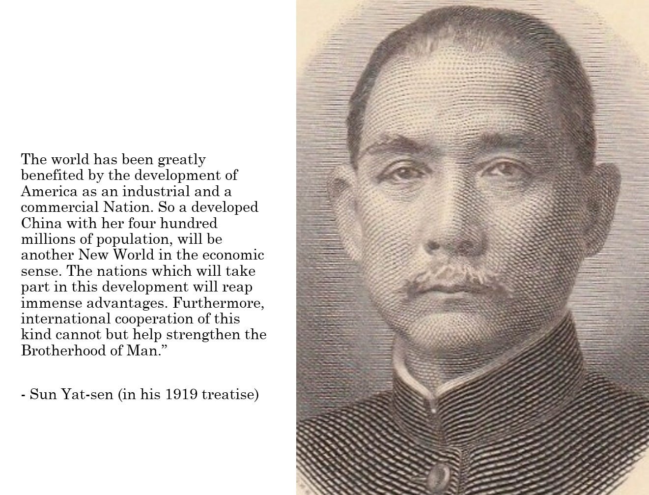 “The world has been greatly benefited by the development of America as an industrial and a commercial Nation. So a developed China with her four hundred millions of population, will be another New World in the economic sense. The nations which will take part in this development will reap immense advantages. Furthermore, international cooperation of this kind cannot but help to strengthen the Brotherhood of Man.”
